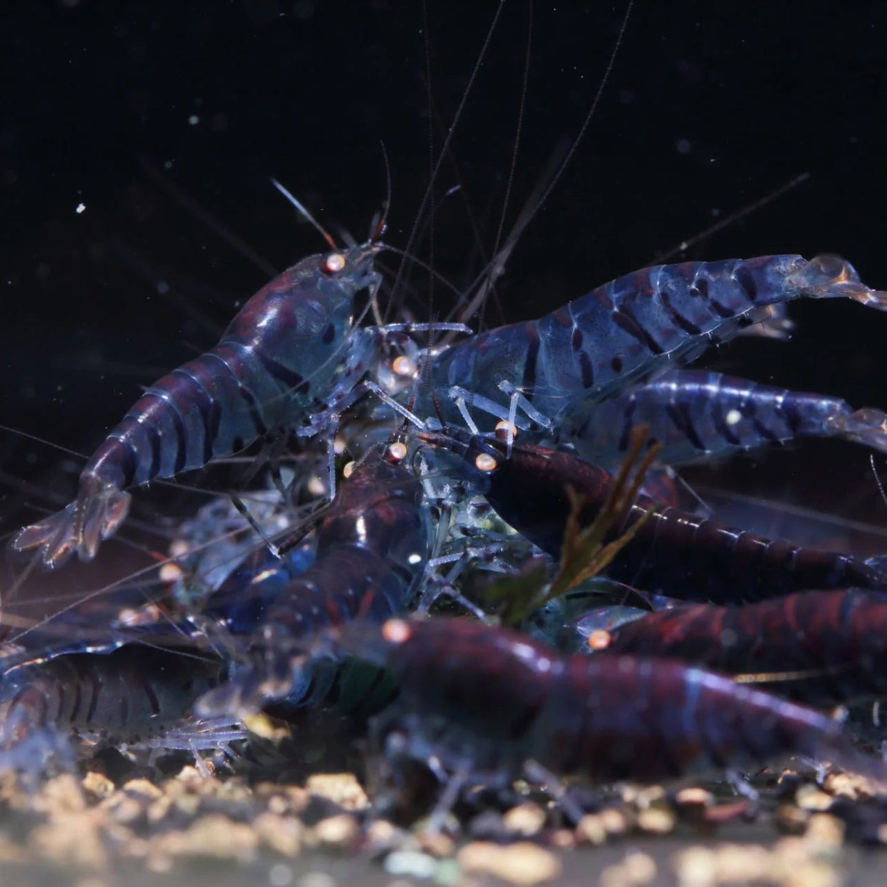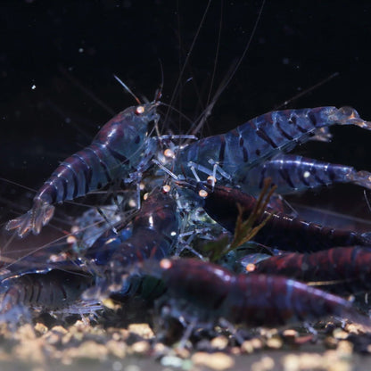Orange Eye Blue Tiger Shrimp is a freshwater aquarium shrimp with a striking blue body and vivid orange eyes, accented by subtle striping. It is active and grazes constantly on biofilm, algae, and detritus, helping maintain tank cleanliness. This live shrimp for sale is peaceful and coexists well with other gentle species. Its bold coloration and contrasting eyes make it a visually captivating addition to a planted or community aquarium.